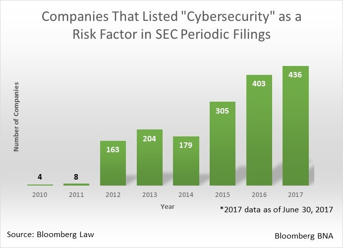 According to Bloomberg BNA based on a review of Form 10-Ks and Form 10-Qs from 2010 to June 30, 2017, 436 companies disclosed cybersecurity as a risk factor in the first six months of this year, compared to 403 companies in 2016 and 305 companies in 2015. This bar graph depicts the dramatic uptick in disclosure over the past several years: