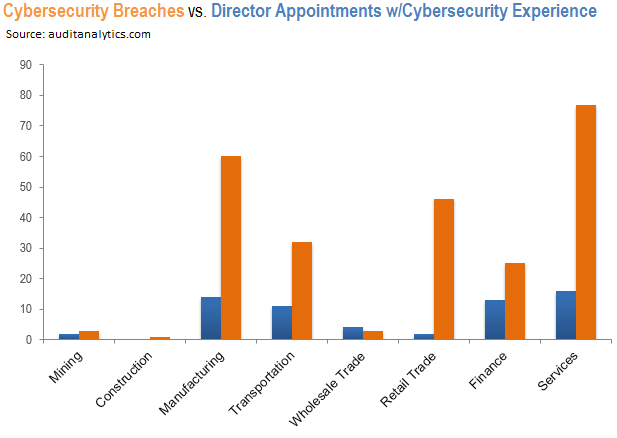 This recent post from Audit Analytics: "Cybersecurity Experts on the Board of Directors" compares on an industry-by-industry basis the prevalence of cyber breaches to the number of directors appointed with cyber expertise, and (inappropriately) concludes - based on the absence of congruency between the two - that certain industry boards are laggards as respects their cybersecurity oversight responsibilities. In other words, the post appears to equate effective board cybersecurity oversight with boards appointing cyber-expert directors.