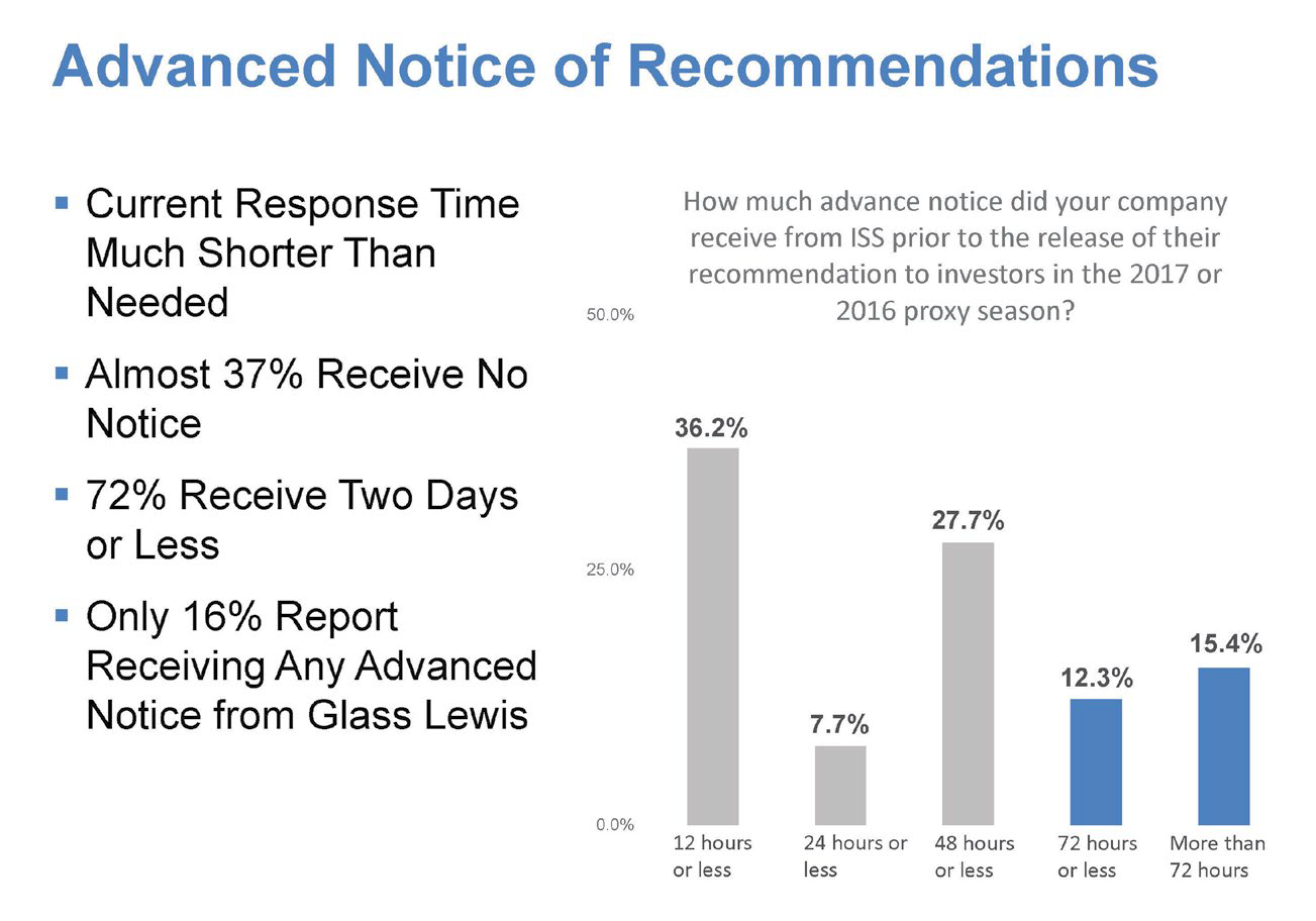Notice & Response Time. This graphic depicts how much advance notice respondents received prior to the proxy advisory firms' release of the adverse recommendations to their investor clients: