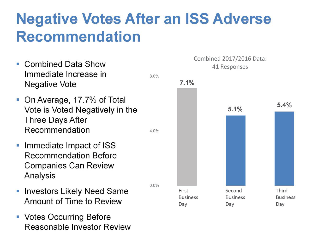 Voting Impact. As shown in the Summary Survey Results, over 19% and 15% of the total proxy votes for 2017 and 2016, respectively, were reportedly cast within three days of an adverse ISS recommendation. This graphic shows the combined 2016 and 2017 data: