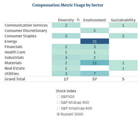 As shown, 57 Russell 3000 companies (concentrated in the energy, materials (mining) and utilities sectors) used environmental compensation metrics; 17 used diversity metrics; and five used sustainability metrics. Looking just at the S&P 500 using the interactive graphic online, 24 companies used environmental compensation metrics; 14 used diversity metrics; and two used sustainability metrics.