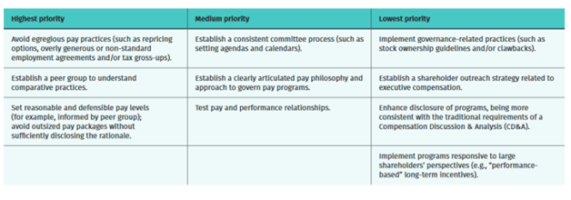 Executive compensation-related considerations are prioritized in the context of the EGC lifecycle with a view toward benefiting from the scaled disclosure requirements and other flexibility common to newly public companies while remaining cognizant of other relevant and potentially impactful considerations (e.g., proxy advisors, institutional investors), as depicted here: