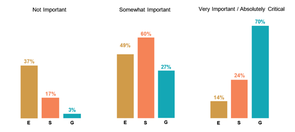 • Corporate governance (the "G") is the most important factor respondents consider in making an investment, as shown here: