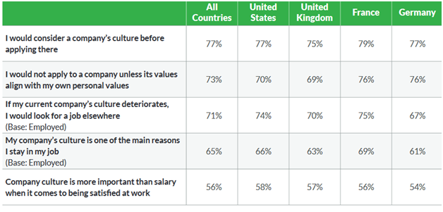 This survey - which also includes instructive data on the importance to employees and prospective employees of company mission & purpose, as well as age-related perspective variances - was conducted online within the US, UK, France and Germany in June among 5,113 adults, 2,025 of whom were US-based.