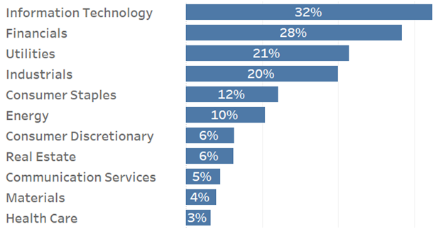Based on its keyword review of proxy statements, 16% of the S&P 500 reportedly have cyber expert directors, varying by sector as shown here: