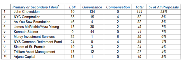 This table shows a breakdown of the types of proposals submitted by the top ten proponents:
