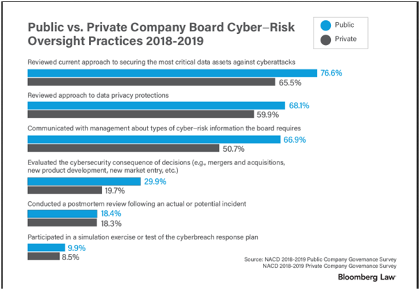 Bloomberg's "Cyber−Risk Oversight Practices of Public and Private Company Boards of Directors" (Word version) compares and contrasts public company and private company board cyber risk oversight practices based on the result of the NACD's 2018-2019 Public Company Governance Survey and 2018–2019 Private Company Governance Survey.