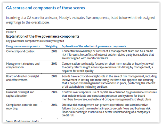 GA scores will consider and evaluate only company information that is publicly disclosed (e.g., SEC filings, investor presentations) across these five governance components, which Moody's deems relevant to governance risk and a credit analysis: