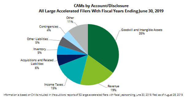 Deloitte's review of CAMs for all large accelerated filers with fiscal years ending June 30, 2019, filed as of the August 29th filing deadline revealed an average of 1.8 CAMs per filing, and a predominance of CAMs relating to goodwill and intangible assets, revenue, and income taxes, as shown here: