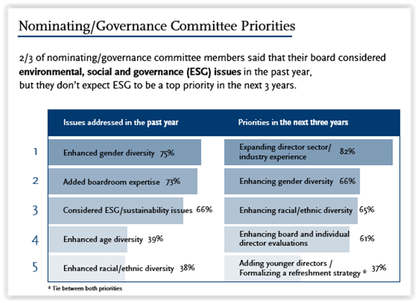 - 2/3 of committee members said that their board considered ESG issues in the past year, but they don't expect ESG to be a top priority in the next three years: