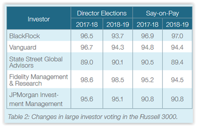 The firm reasonably surmises that the 2.4% year-over-year decline in Vanguard's support for directors may be attributable to its new overboarding policy.