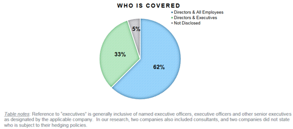- What is covered? - 58% disclose policies that prohibit both hedging and non-hedging derivative transactions, whereas 43% of policies prohibit only hedging transactions.