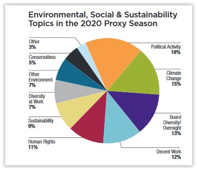 In terms of filed proposals, corporate political activity proposals account for the largest single category at 18% of all proposals, followed by climate change (15%), board diversity (13%), decent work (12%) and human rights (11%), as depicted here: