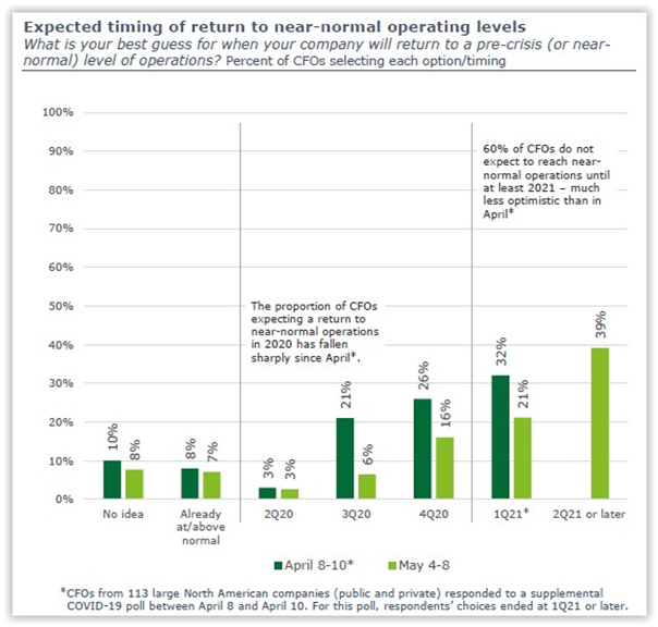 Notably, nearly 40% of respondent CFOs across industries don't expect to return to near-normal operating levels until the second quarter of 2021 or later; another approximately 20% are projecting near-normal operations as of Q1 2021. As shown here (p. 13), this reflects a substantial change in sentiment from Deloitte's survey in April, which reflected projections of near-normal operating levels among most respondents by Q4 2020: