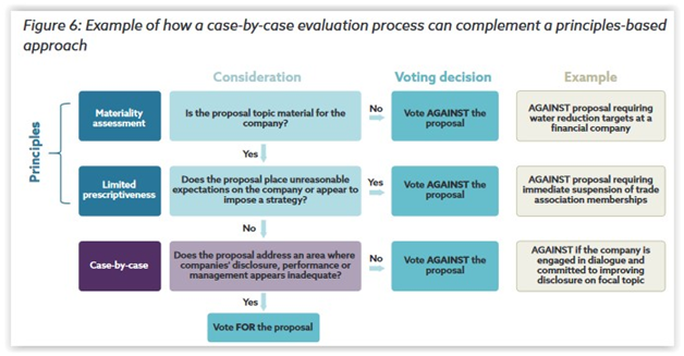Based on their potential financial implications (positive or negative) and heterogeneity, Norges Bank Investment Management's "Shareholder Proposals on Sustainability" proposes a framework for asset managers to guide their decision-making on E&S proposals. The framework relies on the guiding principles of materiality (which NBIM notes may vary by investor based on their different mandates and investment horizons) ) and limited prescriptiveness (based on the agency model of governance and disparate shareholder interests, capabilities, and investment horizons) in the context of company-specific circumstances, as shown here: