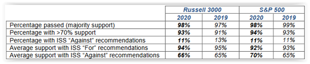 This table from Sullivan & Cromwell's "2020 Proxy Season Review Part 2—Say-on-Pay Votes and Equity Compensation" captures the voting implications of the 2020 proxy season say-on-pay story, with ISS recommendations continuing to significantly influence shareholder support: