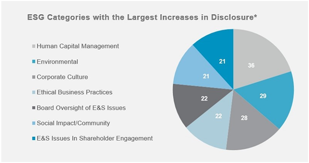 According to White & Case based on its review of 2019 and 2020 Form 10-Ks and proxy statements, all of the 50 largest Fortune 100 companies increased their ESG disclosure in their proxy statements and 42% increased their ESG disclosure in their Form 10-Ks year-over-year, with the most significant increases observed in these seven categories: