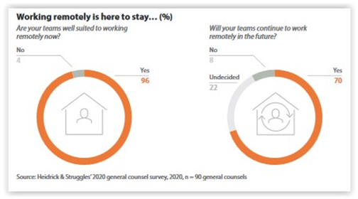 General counsel responding to Heidrick & Struggles' recent survey are largely pleased with how their teams are performing under current remote working arrangements and expect remote work to continue going forward, as shown here: