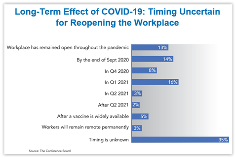 According to the results of The Conference Board's online survey of more than 1,100 US managers and executives August 19 - 26, reopening plans remain murky for many, with 35% indicating that their timing for reopening the workplace was still unknown as shown here: