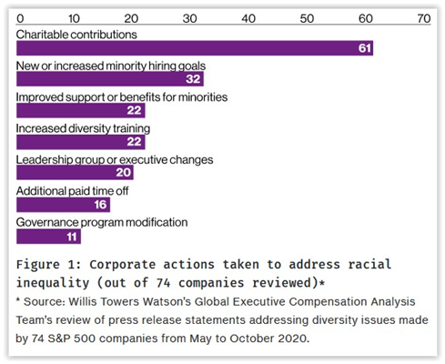 Willis Towers Watson’s analysis of the press releases of the 74 S&P 500 companies whose statements included tangible, specific commitments to address racial inequalities following the George Floyd killing revealed these common themes: