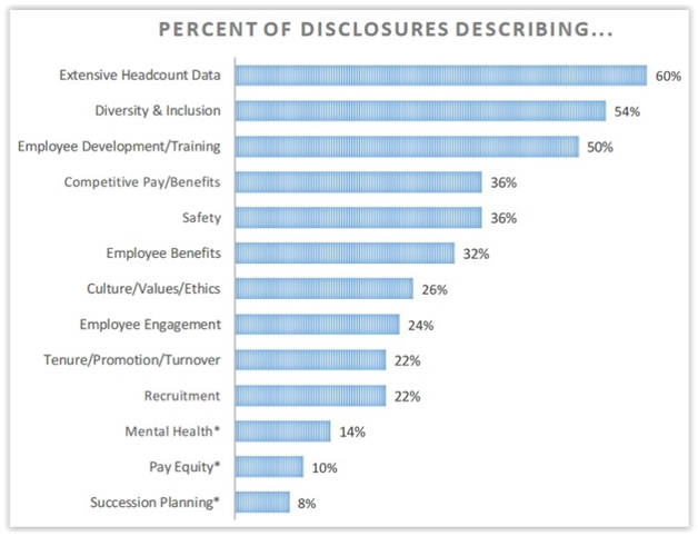 The report includes two sample disclosures for most topics (to show different approaches) from referenced Form 10-K filings for all of the above topics but mental health, pay equity, and succession planning, which were less commonly discussed. Expanded headcount beyond the number of employees as required by the old rules reportedly included employee data by e.g., business segments/geography, gender, and/or ethnicity.