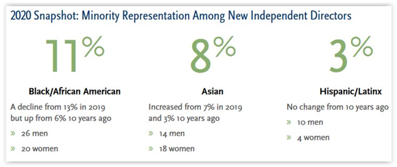 - Of the total new independent directors, 22% are minorities (compared to 18% five years ago and 12% ten years ago), as follows:
