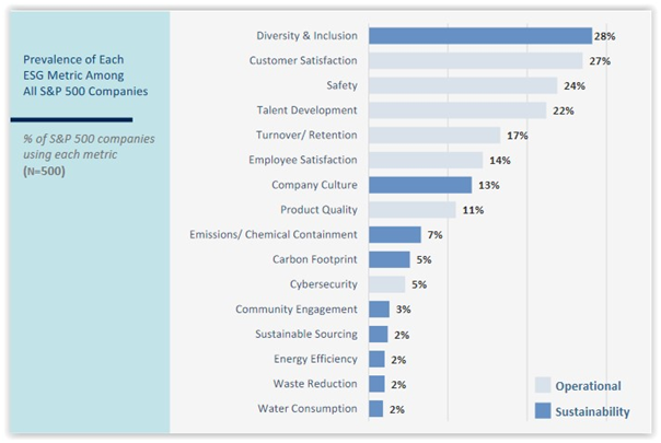 ESG metrics generally, and sustainability-related (as opposed to operational) metrics specifically, were more prevalent among the 200 largest companies in the S&P 500 than the smaller 300 S&P 500 companies.