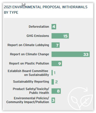 - The 12 environmental shareholder proposals that have passed involved GHG emissions (4 proposals), climate lobbying reports (4 proposals), deforestation (2 proposals), climate change reporting (1 proposal), and plastic pollution reporting (1 proposal).The number of proposals voted pales in comparison to the 82 environmental proposals that were submitted and later withdrawn, presumably based on company/shareholder engagement.