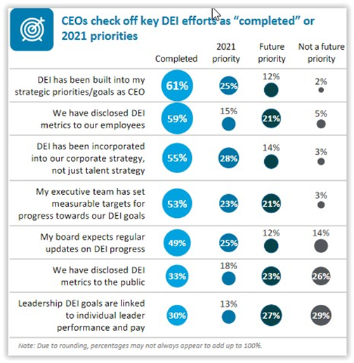 A January 2021 Fortune/Deloitte CEO survey revealed a strong commitment to DE&I that, based on the above, appears to be playing out in practice, with 94% of respondent CEOs having then identified DE&I as personal strategic priority/goal; 90% saying their organization aspires to be an industry leader in DE&I; and 72% reporting plans to publicly disclose DE&I metrics.