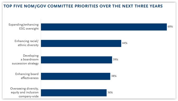 - Nearly 70% of respondents identified expanding/enhancing ESG oversight as among their top five priorities, as shown here: