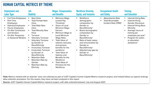 JUST Capital’s new report reveals trends in human capital data disclosure among the 100 largest US employers (more than one-third consisting of consumer discretionary companies) across 28 metrics within five of the six aspects of human capital it characterizes as broadly defining different facets of human capital based on GRI, SASB, and other third-party standards. Notably, the metric categories appear to closely track the areas SEC Chair Gary Gensler has identified as potential candidates for the SEC’s forthcoming human capital disclosure rulemaking proposal: (i) Employment and Labor Type, (ii) Job Stability, (iii) Wages, Compensation, and Benefits, (iv) Workforce Diversity, Equity, and Inclusion, (v) Occupational Health and Safety, and (vi) Training and Education.*
