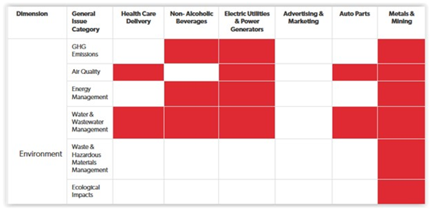 SASB’s new Materiality Finder makes it easier to identify quickly which SASB disclosure topics apply to a particular company and/or an industry and to compare that information to other companies/industries via an online search tool without having to download the SASB standards. For example, this table, which illustrates the online functionality of the tool, shows which environmental topics SASB deems likely to be material for companies across six of its 77 industry classifications: