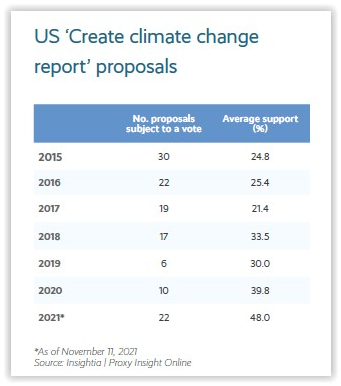 Support for climate change reporting proposals among the “Big Three” (BlackRock, Vanguard, and State Street) has skyrocketed over the past 5+ years, and within the past year in particular, while average investor support overall has doubled since 2015, as shown here:
