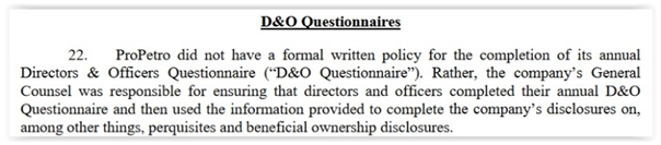 According to the Order, all of the D&O Questionnaires the former CEO completed for multiple SEC filings over a 3-year period misstated or omitted material information such as the stock pledge information and perks, some of which he charged to a corporate credit card, and others that were inappropriately incurred or authorized and paid directly by the company. He also completely failed to complete a D&O Questionnaire in one of the relevant years.