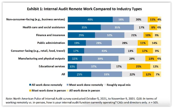 The Remote Auditor” from the Internal Audit Foundation and AuditBoard reports on the results of recent surveys aimed at understanding the prevalence and implications of the COVID-prompted remote work phenomenon on the internal audit (IA) function. Not surprisingly, the majority of chief audit executives affirmed that their audit teams are primarily or exclusively working remotely; however, the results vary quite significantly by industry, as shown here: