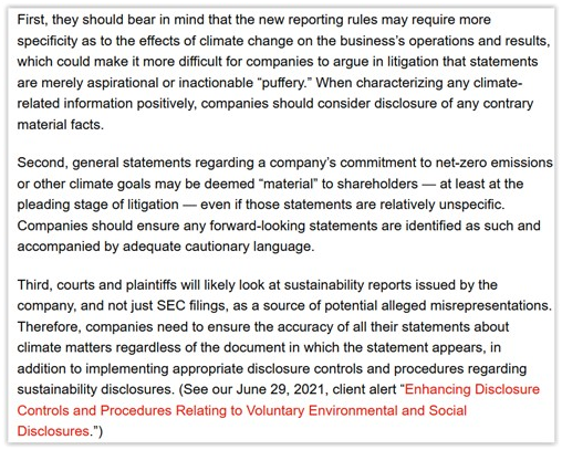 See also “Activists Increasing Scrutiny of Net-Zero Climate Pledges and Alleged ‘Greenwashing’” (Winston & Strawn) and “ESG Activists Seen Targeting Firms on Net-Zero Emissions Claims” (Bloomberg Law), and additional resources on our Climate Risk & Disclosure page. This post first appeared in the weekly Society Alert!