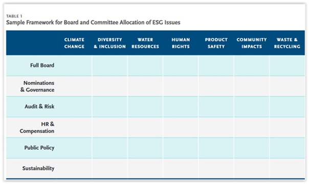 In that board structures and material ESG issues differ by company, the template should be tailored to the company’s specific circumstances. The overarching objectives are to ensure the absence of oversight gaps on ESG issues identified by the company as material and proper documentation of oversight responsibilities in committee charters, corporate governance guidelines, or other appropriate governance documents.