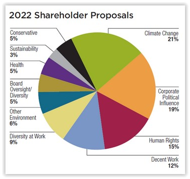 In terms of filed proposals, climate change proposals account for the largest single category at 21% of all proposals, followed by corporate political influence at 19%, and human rights at 15% as depicted here: