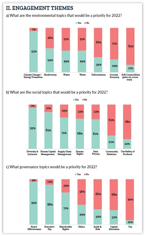 The report also shares the results of an institutional investor survey conducted in late 2021 concerning shareholder-company engagement on governance and sustainability matters. Among other things, the survey revealed investors’ environmental, social, and governance engagement priorities: