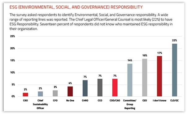 While responsibility for ESG varies widely, it most often falls on the CLO/GC, as shown here: