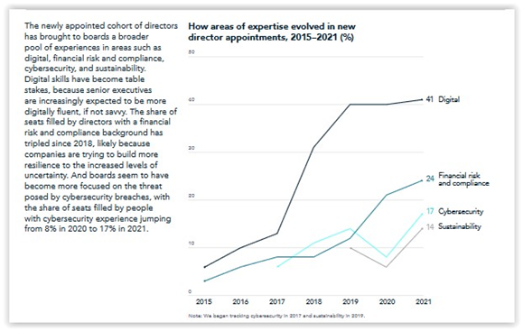 - Consistent with evolving risk profiles and stakeholder focus, last year saw a marked increase in digital, cyber, and sustainability experience, as shown here: