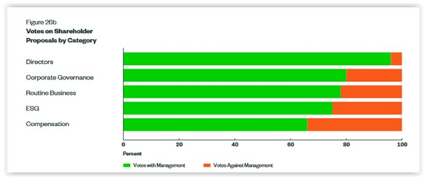 State Street voted in accordance with management recommendations on 90% of shareholder proposals (4,090 of 4,524 voted with management) worldwide. By shareholder proposal category, it voted against management’s recommendations most frequently on compensation-related proposals, followed (in descending order) by ESG, routine business, and corporate governance proposals.