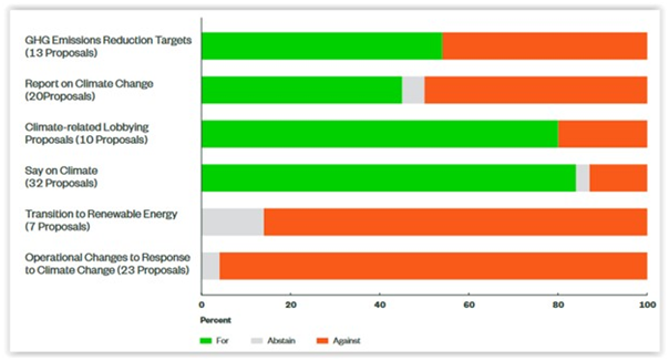Globally, State Street engaged with 254 companies on climate change risks. Notwithstanding reservations about potential unintended consequences associated say-on-climate voting generally, it supported 84% of the 32 say-on-climate proposals that went to a vote. Its support for other climate-related proposals varied, as shown here: