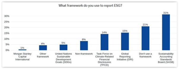 The most common ESG reporting framework is SASB, followed by those who don’t use any framework, as shown here: