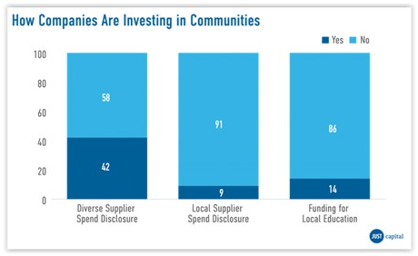 According to JUST Capital’s racial equity tracker, just over half of the 100 largest US companies disclose at least one of these three aspects of “community investment”: (i) diverse supplier spend; (ii) local supplier spend; or (iii) funding for local primary or secondary schools (excluding employee donation-matching programs to schools and scholarships), with disclosure on diverse supplier spending far exceeding disclosure across the two other categories.