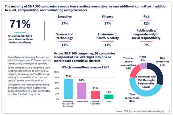 In addition to a robust summary of shareholder proposal activity, “Trends and Updates from the 2022 Proxy Season” from Freshfields includes a wealth of benchmarking information on board practices as they relate to ongoing and trending investor focus areas that include board oversight structure (see example below), composition, and refreshment, and board and management diversity, as well as relevant regulatory and other developments, no-action letter statistics, and proxy advisor and major institutional investor policies and positions on board and workforce diversity/DEI, director overboarding, and other key topics.