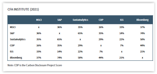 The table below shows the low correlation of scores across ratings providers. For example, ISS ESG ratings have a 33% correlation with MSCI; a 14% correlation with S&P; a 22% correlation with Sustainalytics; a 7% correlation with CDP; and a 21% correlation with Bloomberg.