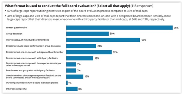 Evaluation facilitator—Evaluations are most commonly facilitated by either the board chair or another director (56%) or the corporate secretary or other in-house personnel (55%). Third-party facilitators are used by 20% of boards, and 15% said they periodically change their facilitation approach (e.g., periodically use a third-party facilitator).