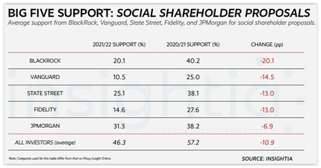 Average support of social shareholder proposals declined by more than 13%, ranging from JP Morgan at the low end (down 6.9%) to BlackRock at the high end of the range (down 20.1%):