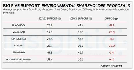 Average support among the “Big Five” of environmental shareholder proposals declined by more than 15%, ranging from JP Morgan at the low end (down 5.4%) to Vanguard at the high end of the range (down 20.9%), as shown here: